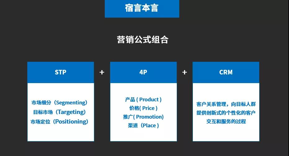 如果说营销是发现需求,满足需求,维持关系,获得回报的思维过程,那么营销人就是将这套思维落地的实践者。落地需要用到一个营销公式组合,就是STP+4P+CRM,如下图。