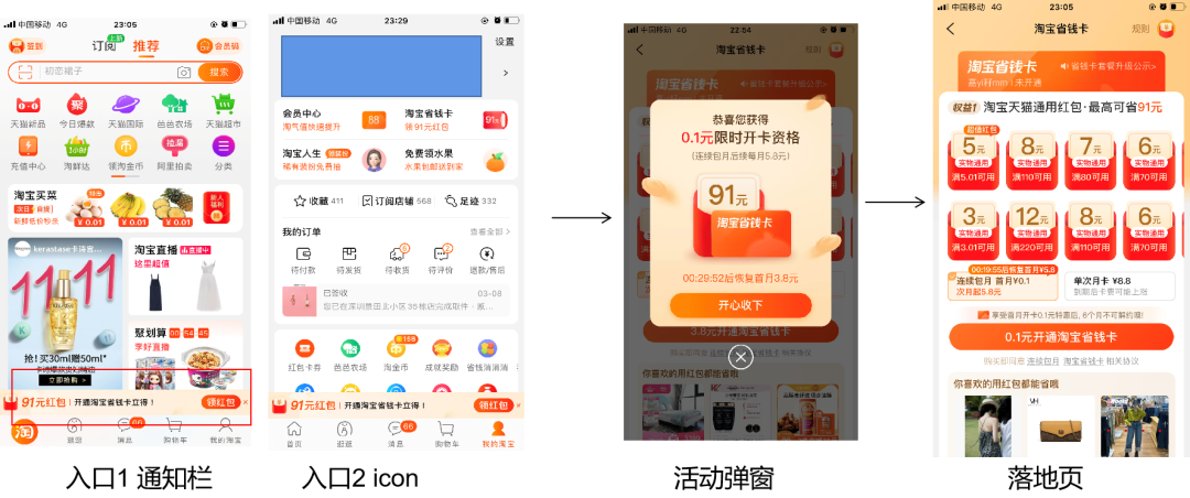露出位置:淘宝算法根据用户画像计算到用户对省钱卡会有兴趣,是否为省钱卡用户,若是符合省钱卡目标人群且没使用过省钱卡或是已经停用了,该用户就会有省钱卡提醒,露出位置在在淘宝首页和我的淘宝模块中,模块考量个人认为主要是:点击切换淘宝模块是流量最大的区域,用户易察觉,个人中心查看物流信息等信息是次流量区。