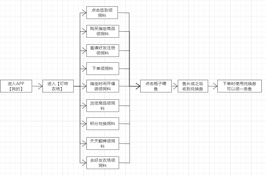 活动流程简单,通过不同的操作,用户都可以领取饲料,并且投喂鱼苗,等到进度条至满格,用户即可领取活鱼,用户的唯一目标是领取活鱼,其他行为是为了得到饲料领取活鱼服务的,因此,流程简单,用户易理解且有唯一的目标去达成。因此可以在设置活动时,应尽可能缩短用户的路径,让用户轻松理解且容易上手