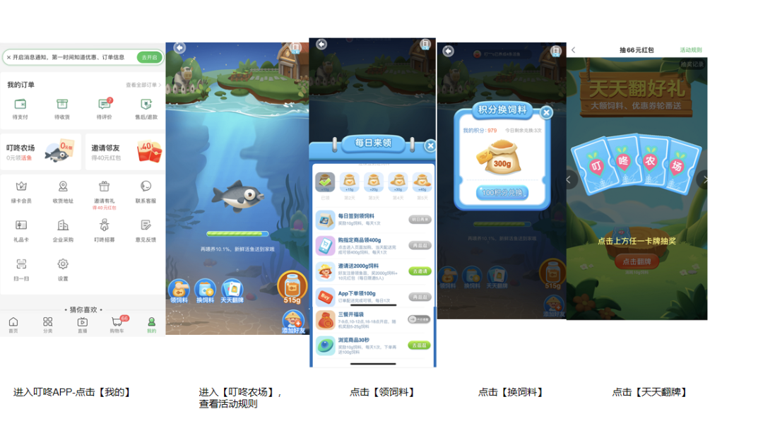 活动形式:养成式小游戏,通过养鱼苗到成熟的鱼,可以得到活鱼奖励,刺激用户积极参与
