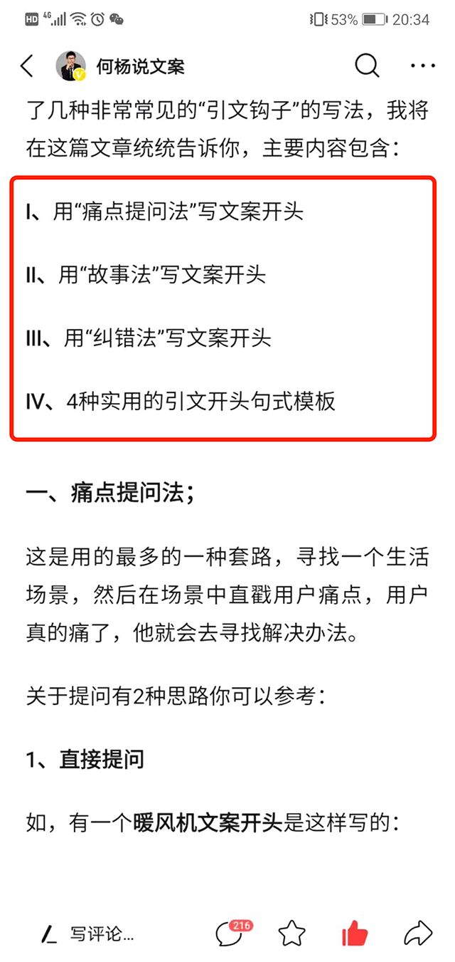 比如我之前有篇文章,是写文案开头的技巧,为了最短时间吸引用户的注意力,让他一直阅读下去,我就做了一个目录前置。