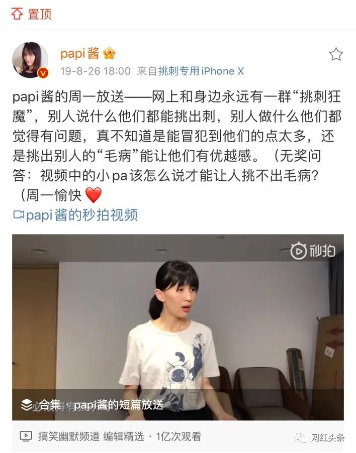 这个视频,一直到现在也还是papi酱的微博置顶作品。