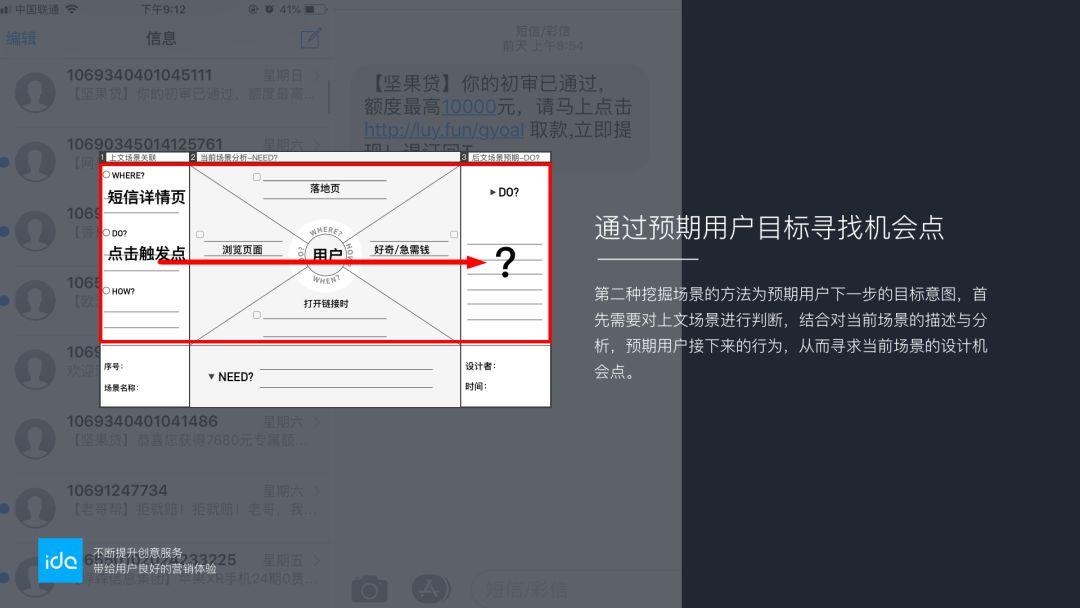 用户/收到短信者(who)从短信列表打开,(上文场景 where)来到落地页(当前场景 where)浏览页面信息(do)想借款(how)。根据上一场景文案触发点,以及当前场景目标和用户行为,猜测到用户存在贷款需求。预期到用户下一步的目标与了解或办理贷款需求等相关,如专人服务、贷款信息模块、机构是否可靠、实时了解贷款情况等服务。基于当前场景,更有针对性地满足用户的需求与期望。