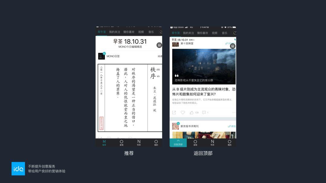 当用户在首页上滑向下浏览时,导航栏的“推荐”按钮替换为“返回顶部”,在不改变布局的情况下实现了提高操作效率的目的。