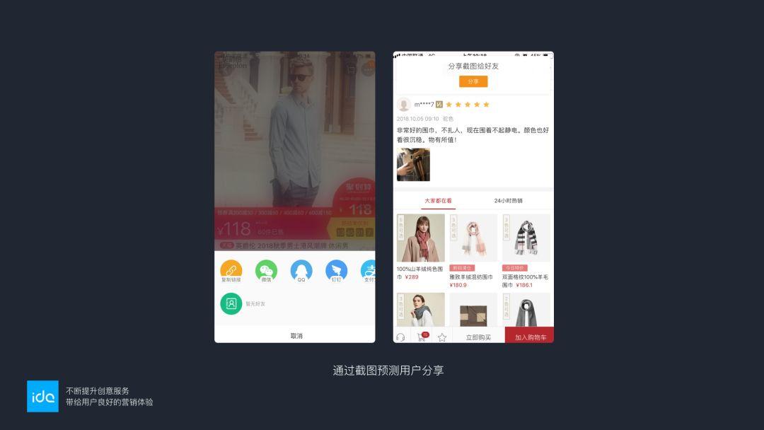 用户在商品详情页进行截图后,预期用户接下来的行动是将该商品分享给好友。因此在该页面弹出推送提示框,提示用户进行分享。在用户需要的时候就出现,缩短了关键流程同时让用户感动。