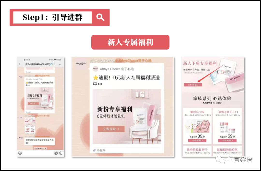 粉丝进群后,Abby会给大家派发0元新人专属福利(首单随单礼),引导顾客首单消费。