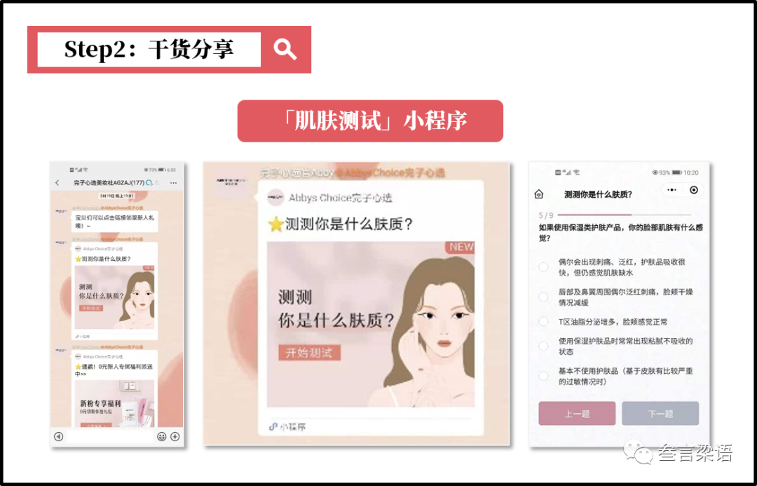 ② 干货分享:通过肌肤测试、护肤知识分享,培养用户认知;