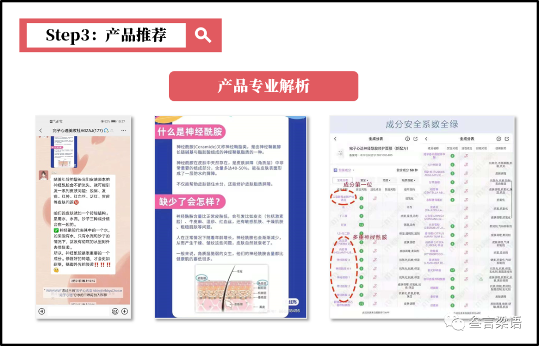 向用户展示"神经酰胺成分溶解性实验",通过晒出"成分安全系数评分表"增强用户信任感,以用户使用前后的对比反馈为产品背书。