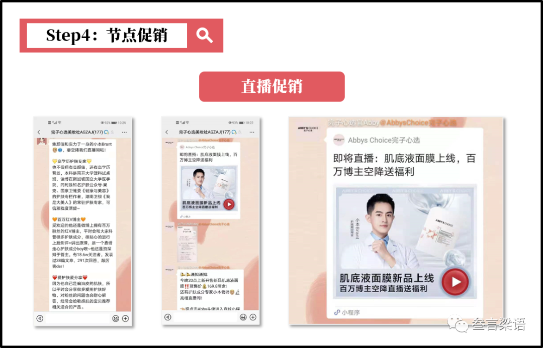 不定期举办直播活动,邀请护肤博主给粉丝分享护肤小知识,通过代言人礼盒、宠粉福利等吸引用户下单。