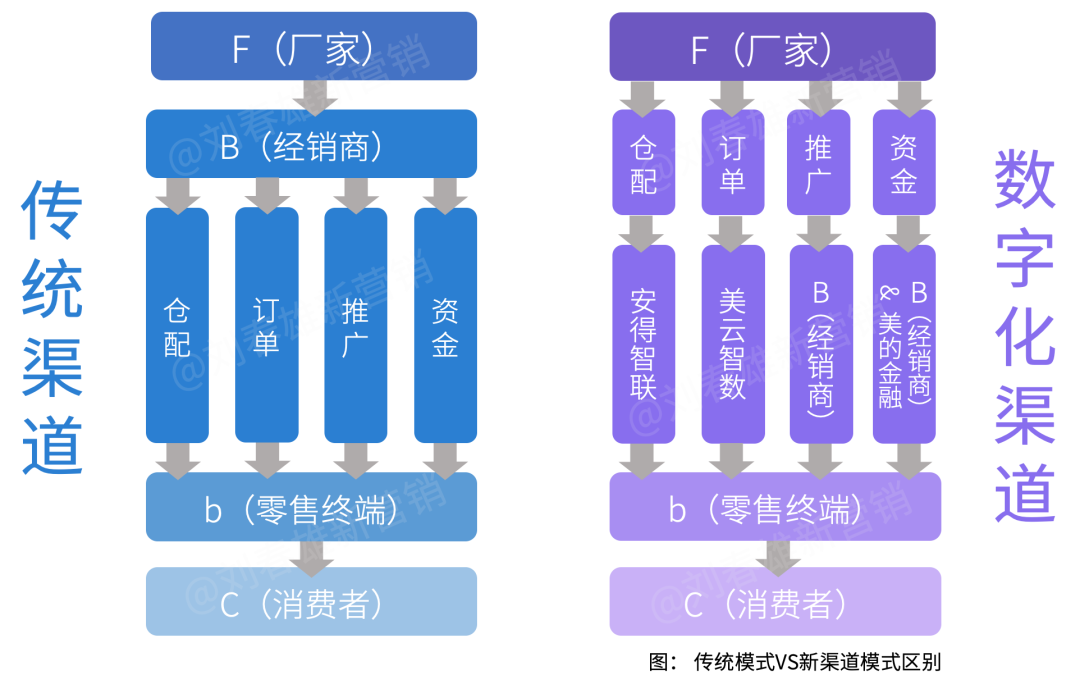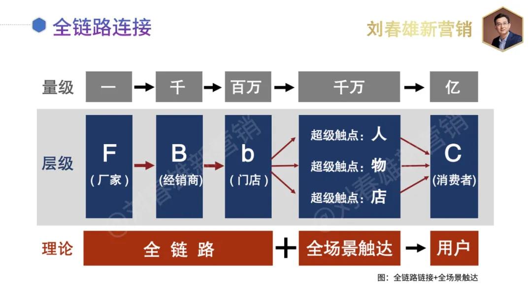 目前,快消品传统渠道包括厂家(F)、经销商(B)、零售商(b),然后触达用户(C)。所以,全链路连接称为F2B2b2C。