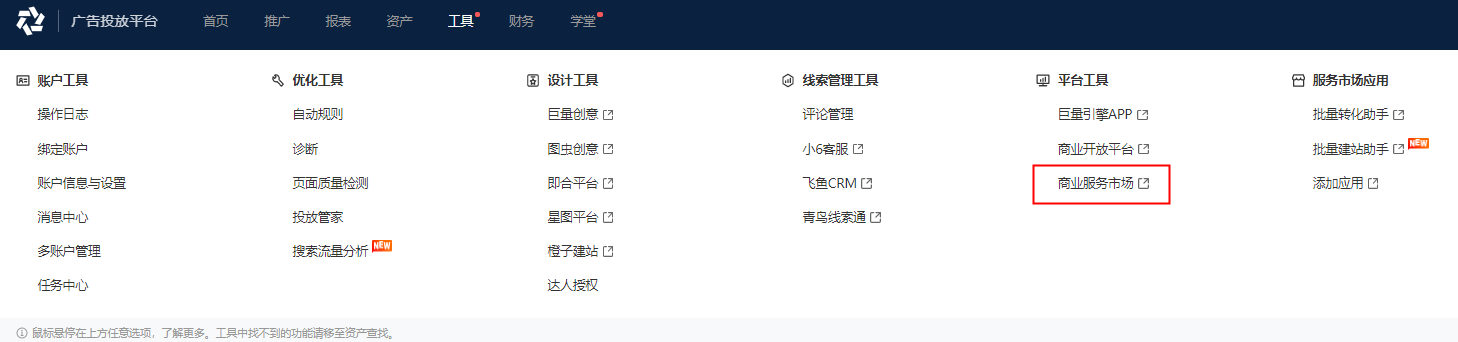 ●为检测转化事件,还需要在资产→转化跟踪根据推广目的和转化目标选择相应的转化跟踪工具。