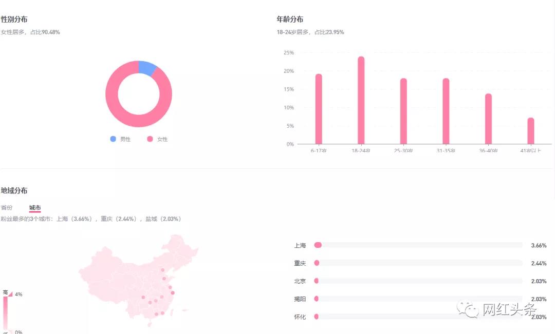 从数据我们可以看出不管是公众号还是抖音,90%的用户都为女性,用户最多的城市也大多在北上广城市。