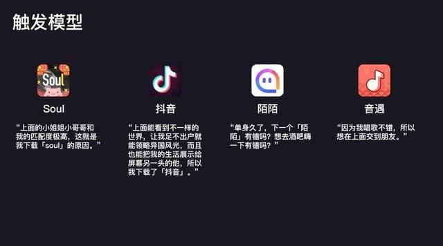上面4款不同的社交App代表着4种不同的用户群体,有想寻找知音的,有想展示自我的,有寂寞了想发泄的,也有一展歌喉的。