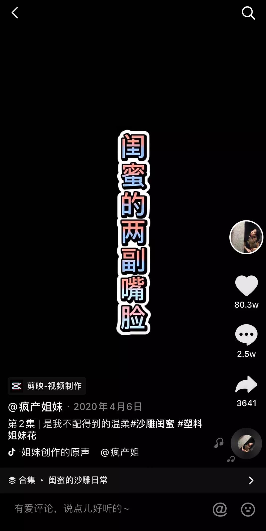 @疯产姐妹早期视频围绕美食展开,真人不露脸,虽然食物拍得很好但反响一般,只有几千点赞数,账号并没有真正火爆起来。而让姐妹俩真正爆起来的一条视频竟然与美食无关,这条在2020年4月6日发布的视频"是我不配得到的温柔",它的获赞量竟然超过了之前所发布的美食相关视频获赞量总和的两倍。