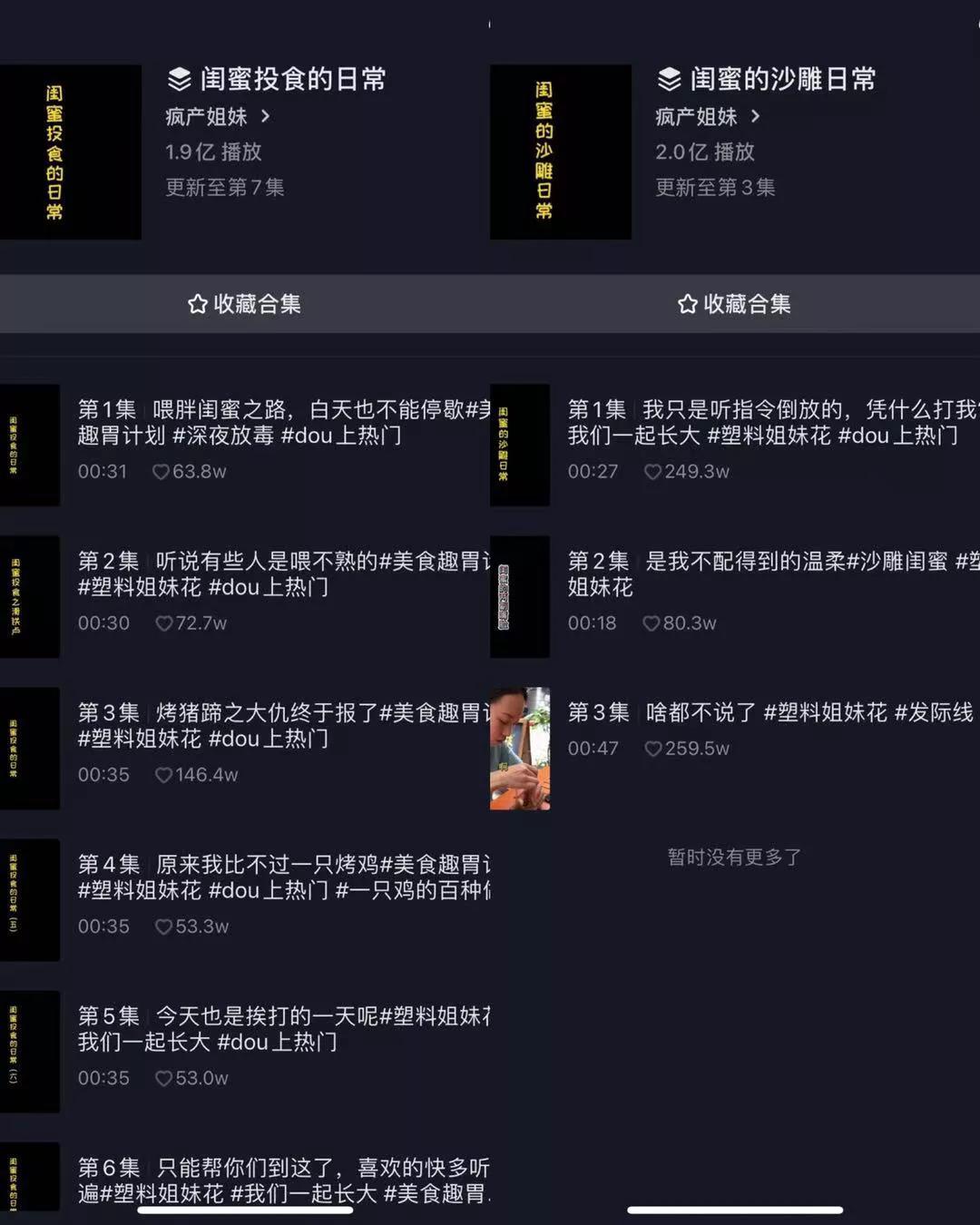 从@疯产姐妹早期的视频内容中可以看出她们是想通过美食出圈,做一个纯粹的美食账号,机缘巧合因为一条记录了闺蜜"两副面孔"的内容成就了第一个小爆款,之后便转型成记录生活类的账号,这一过程则为广大短视频创作者提供了一个账号转型的思路。