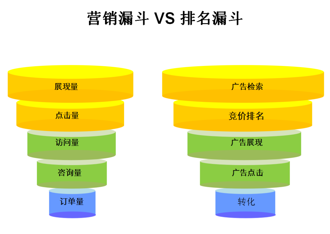 优化师入门第一课就必学的营销漏斗,现在再加入排名漏斗的概念,其实很好理解。效果好坏,展现量影响着点击量,而展现量却因为排名的问题,很大程度上决定着点击率。所以要有高的点击率,就不仅是因为创意要有吸引力,还需要有一些符合系统要求,并令系统“喜欢”的一系列操作。