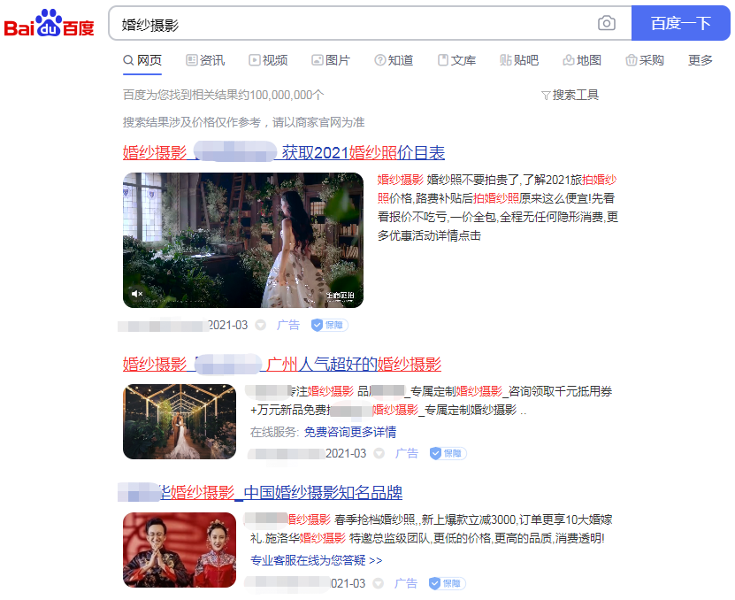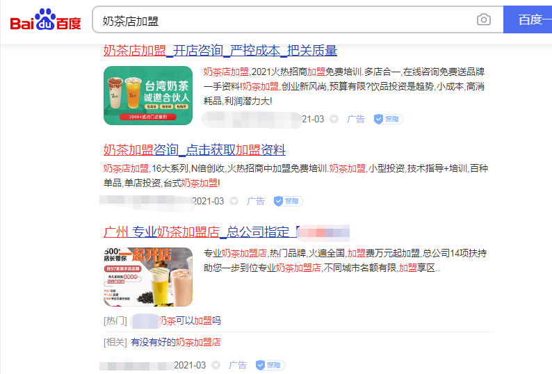 上两图是以“婚纱摄影”和“奶茶店加盟”为例,经过多个浏览器,多次测试以后平均的展现的截图,都可以看得到,创意标题在一开始设置关键词作为通配符,让系统最先触发其关键词,不仅引发飘红还能有更多的排名优势,更别说这些广告主可能还会出高价,提高闪投系数等其他细节。