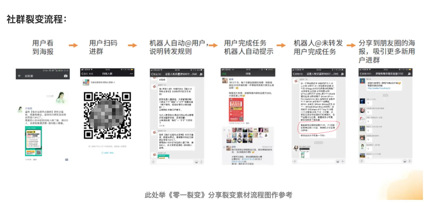 通过带诱饵的海报来吸引种子用户推广,从而进入社群。通过社群内的自动化提醒话术,促使群内用户完成转发海报任务,利用群成员的社交关系,带领更多的新用户进群,扩大圈层传播的过程。
