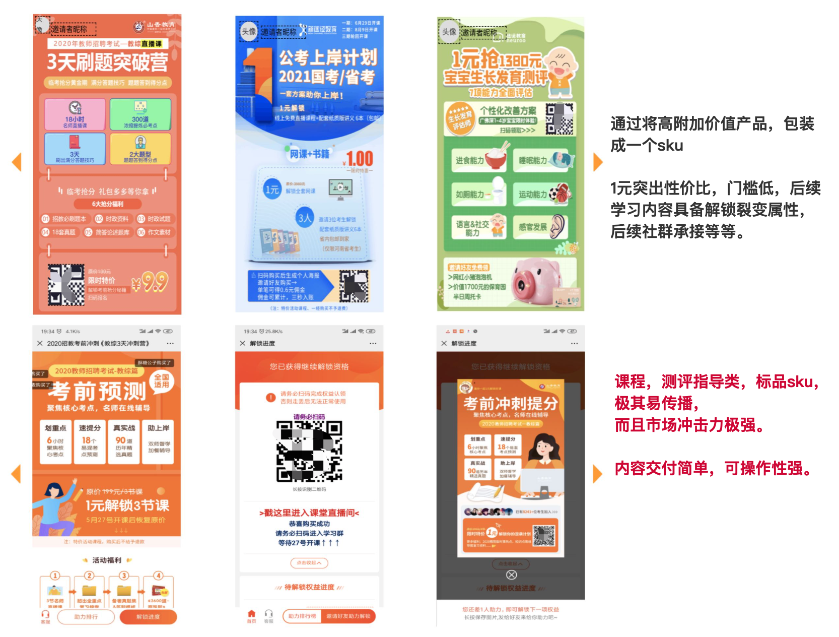 助力拼团的升级变式——1元解锁。通过有价值的相关内容,整合成精美的sku,然后通过低价进行裂变传播,筛选付费用户的同时,让用户更加平滑的进入私域,轻松获客。笔者团队目前仍能利用这套玩法,较低成本去获客。