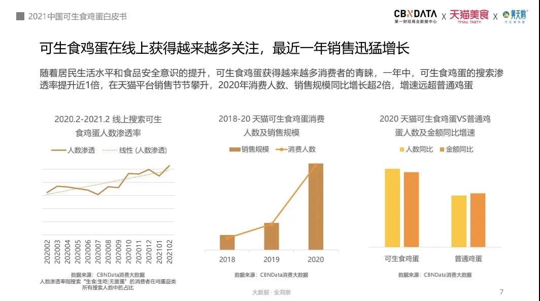 在这样的背景下,高品质的可生食鸡蛋成了这两年来蛋品消费者的新宠。据CBNData消费大数据显示,可生食鸡蛋已成为天猫蛋品中增速最快的品类,2020年消费人数、销售规模同比增长超200%,已贡献天猫蛋品近1/4的市场份额。