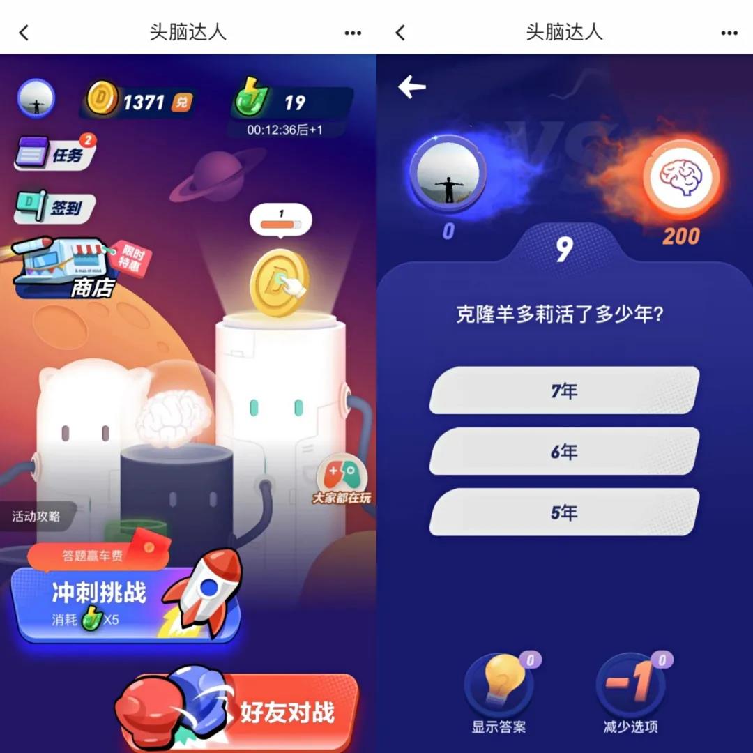 滴滴头脑达人小游戏是滴滴用来提高产品的用户使用时间,让用户通过玩游戏中累积金币可以兑换打车券的方式,提高打车的频率,进而提高单个用户价值。目前游戏有2个模式:随机匹配和组队PK。