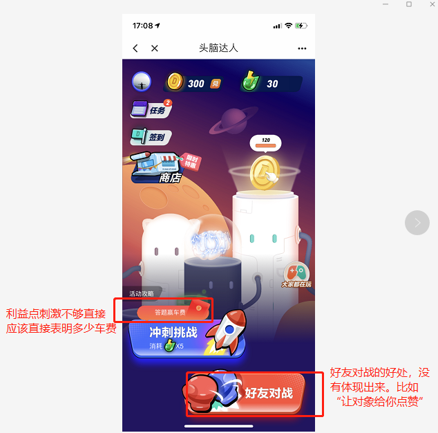 游戏中有组队模式,分享模式,均能够触发用户参与游戏。只不过利益点刺激不够,如果能够把打车券等最终能够给用户的东西展现出来,也许刺激效果会更好,游戏的目的是为了让用户获得打车券,并不单纯是为了让用户玩游戏。