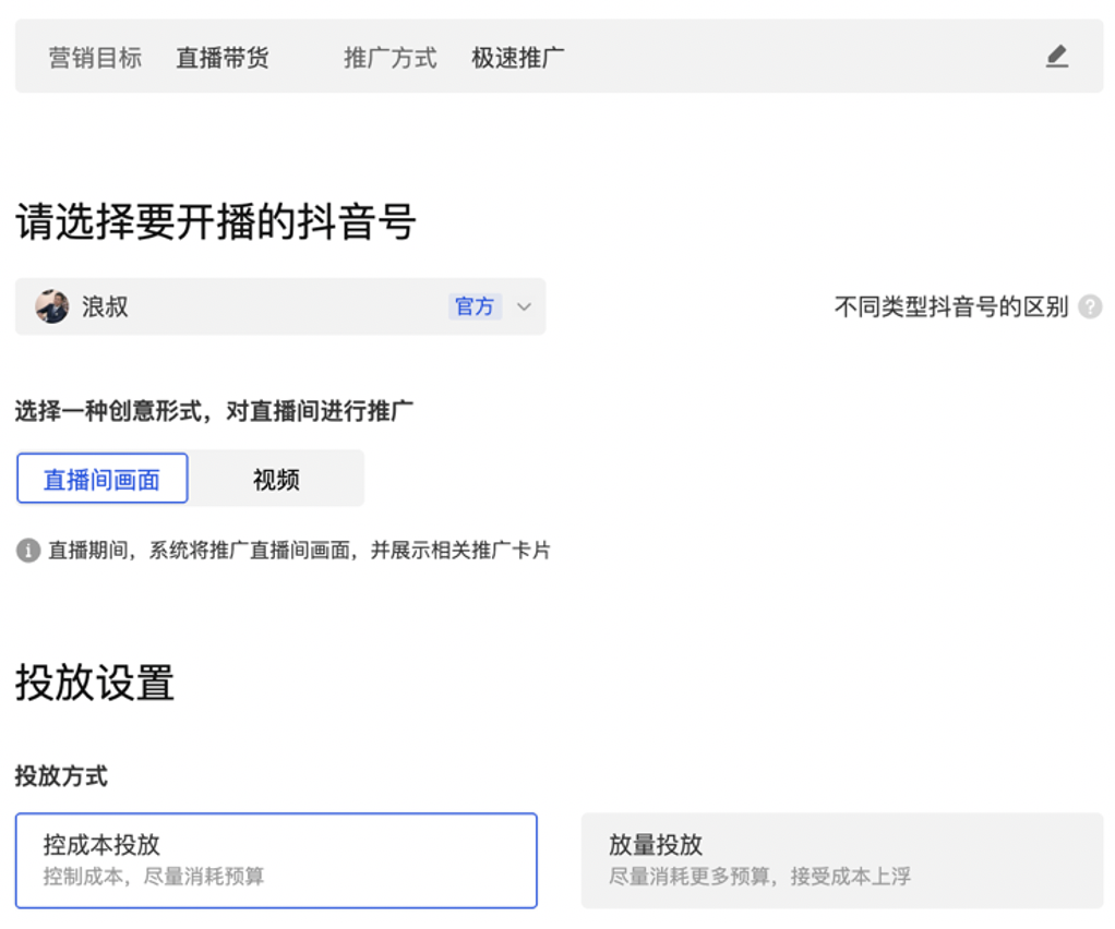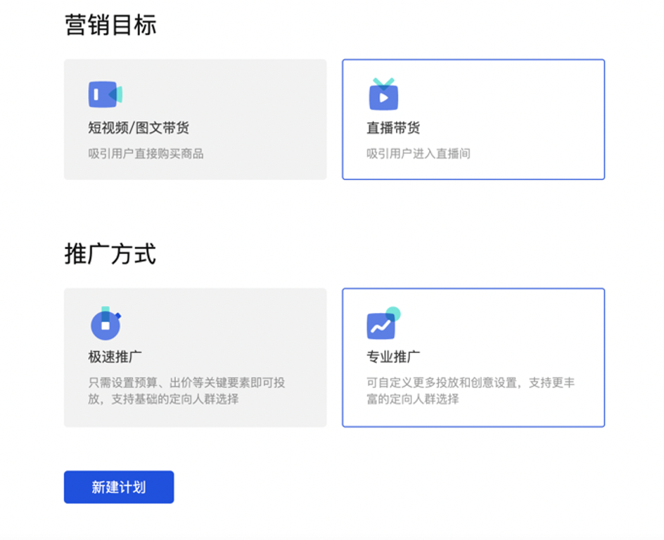 我们再来看看千川的投放方式。如下图,短视频/图文带货为原鲁班投放,直播带货为feed投放,两种方式均分为极速推广和专业推广。