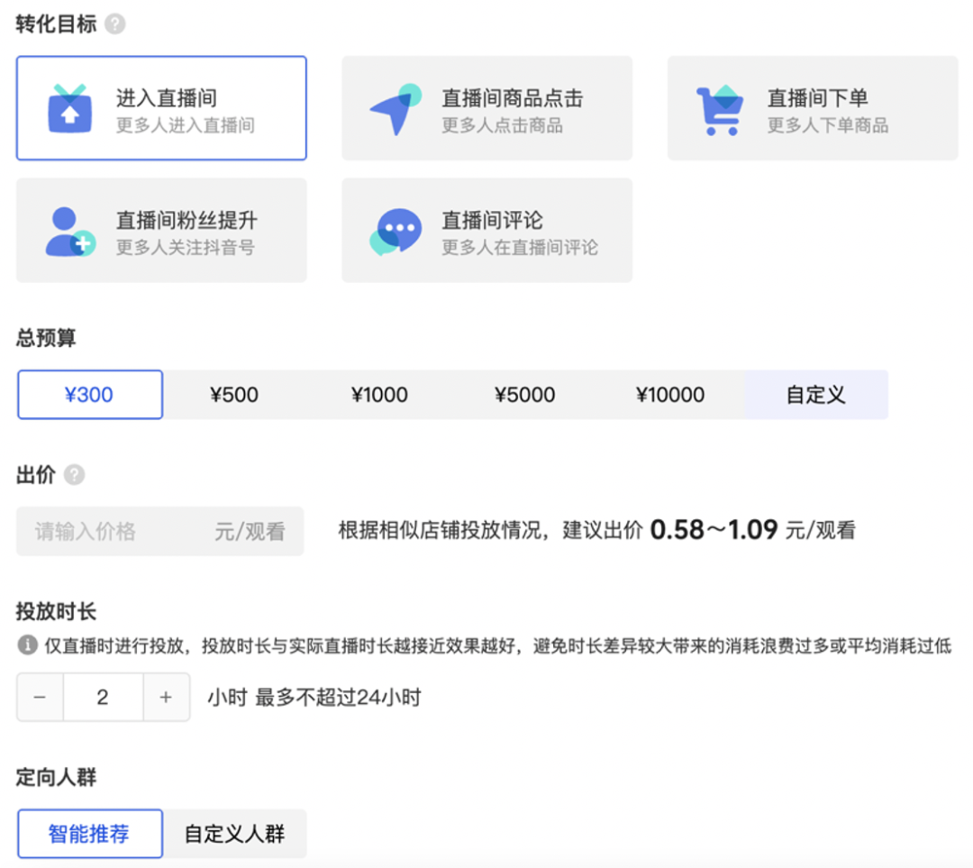 这种方式更适合没有投放经验的商家用户自投,操作简单,几乎没有定向,一键设置出价预算即可投放,具体内容如下图。