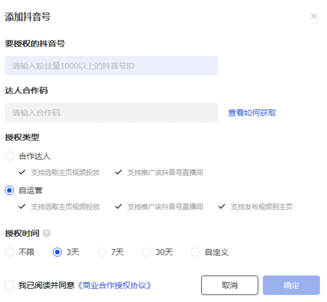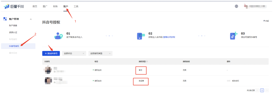 如果需要绑定其它抖音号,可以通过「账户-抖音号授权」来完成,授权类型会显示"自运营"。如下图所示:
