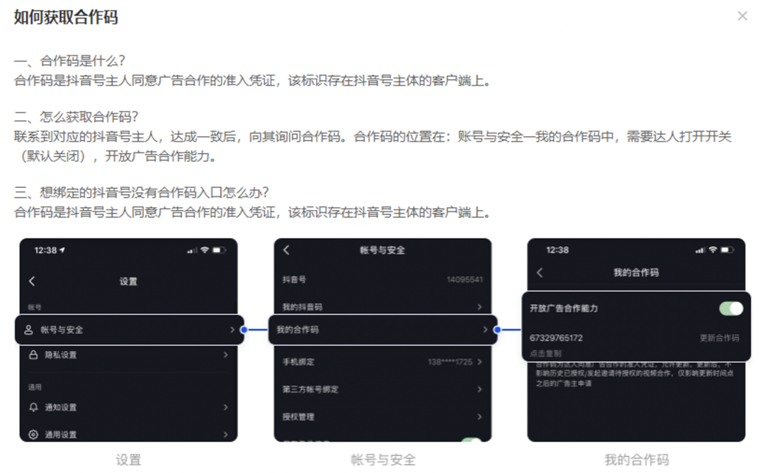 满足以上要求后,继续按照如图操作即可获得达人合作码。