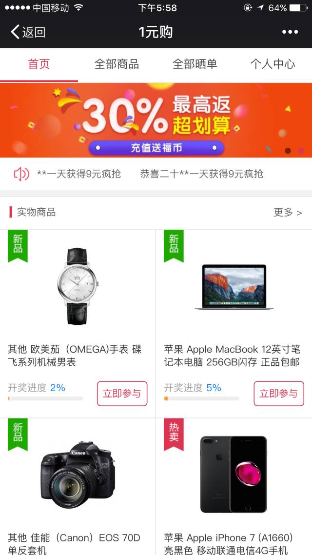没错就是被玩烂的一元购,不管是网易还是新浪这类大平台还是大大小小的公众号都在某个时期爽得不行。有节操的抽个水,8000块的东西筹措10000块给幸运用户,没节操的就不说指定中奖用户了,大部分跟线上"功德箱"一模一样,物件只是一个噱头罢了,人家是空手套白狼。