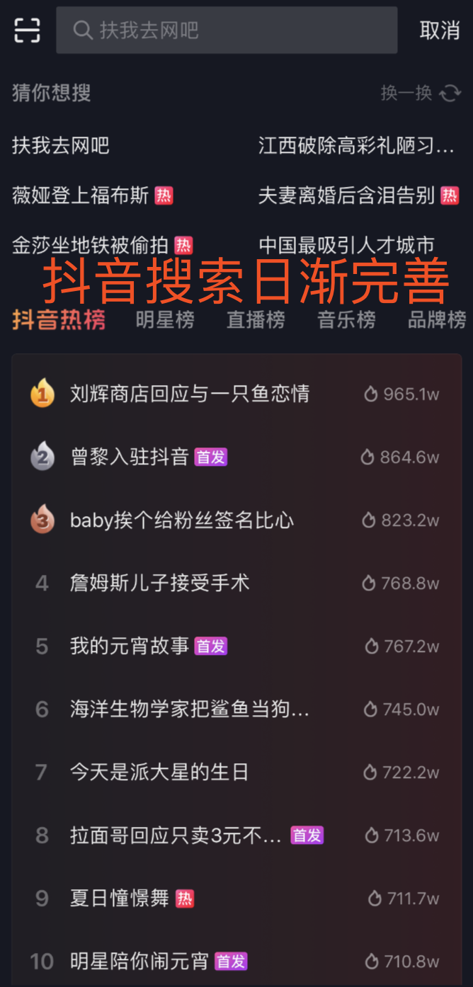 我说过,希望抖音可以成为人类文明的视频百科全书,视频搜索就是这部书的索引,是寻找答案,收获新知的入口。当然,把视频搜索做好很难。接下来的一年,抖音将加大对搜索的投入力度,欢迎对视频搜索感兴趣的研发、产品、运营同学加入我们!也欢迎大家多用抖音搜索,多向我们提意见!”