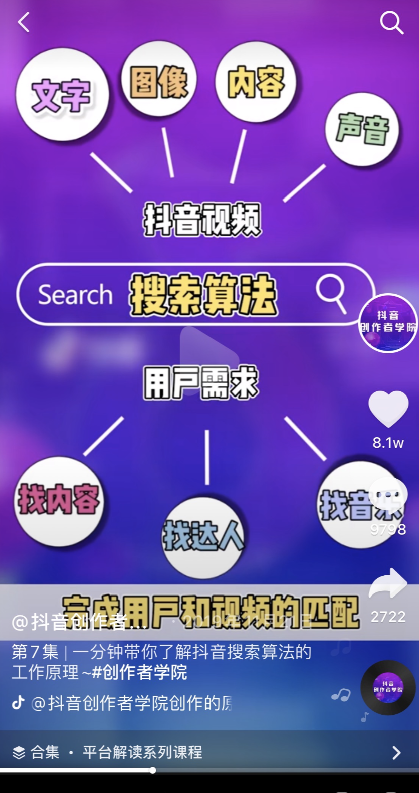 需要特别提出的一点是“账号”是一种广义上的称谓,例如抖音里面的“合集”其实也是账号的变种,有权重加成,很多关键词排前面的都是合集,这点是可利用的。拓展一下,像传统搜索引擎,每个网站都是账号,百度贴吧、百度百科、百度知道也都是一种账号。