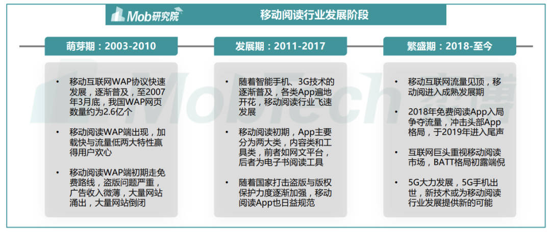 随着技术的发展,移动阅读从WAP走向了App,行业从萌芽期迈入繁盛期用时不足20年,如今行业格局相对稳定,资源向头部集中,中小企业难出头,新入局成本高昂。