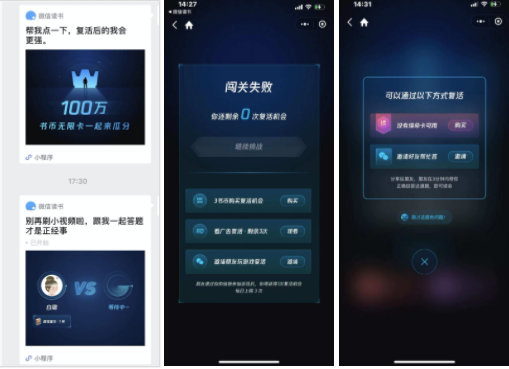 瓜分百万书卡对比冲顶大会的瓜分奖金的逻辑,刺激度略弱,奖励的书币、免费书等等仅针对微信读书本身的活跃用户有激励效果