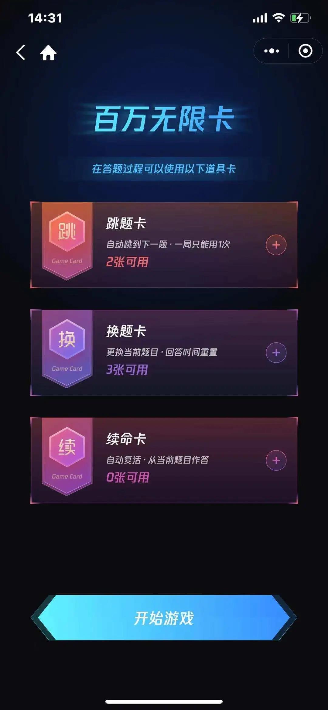 道具卡的引入降低活动门槛:在每日一答瓜分奖金的活动机制中,系统会自动送给用户三种不同类型的卡片,跳题卡、换题卡和续命卡,以降低答题闯关的难度,用户在闯关过程中可以充分使用这些卡片。