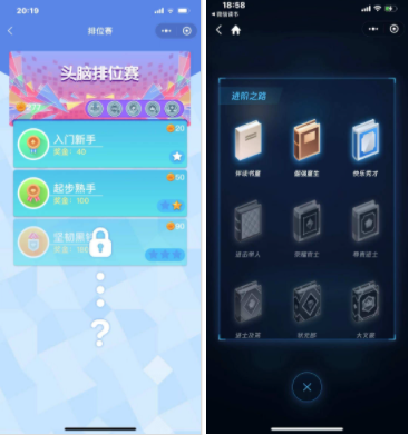 对比头脑王者竖排的解锁方式来看,微信读书进阶的排列和设计让人感觉解锁的欲望不足,并且一下公布所有的后续解锁虚拟形象,也没有针对未知的吸引和神秘,针对高端玩家的特权设计也不太足,可以继续优化迭代,提升用户持续解锁和留存活跃的积极性。