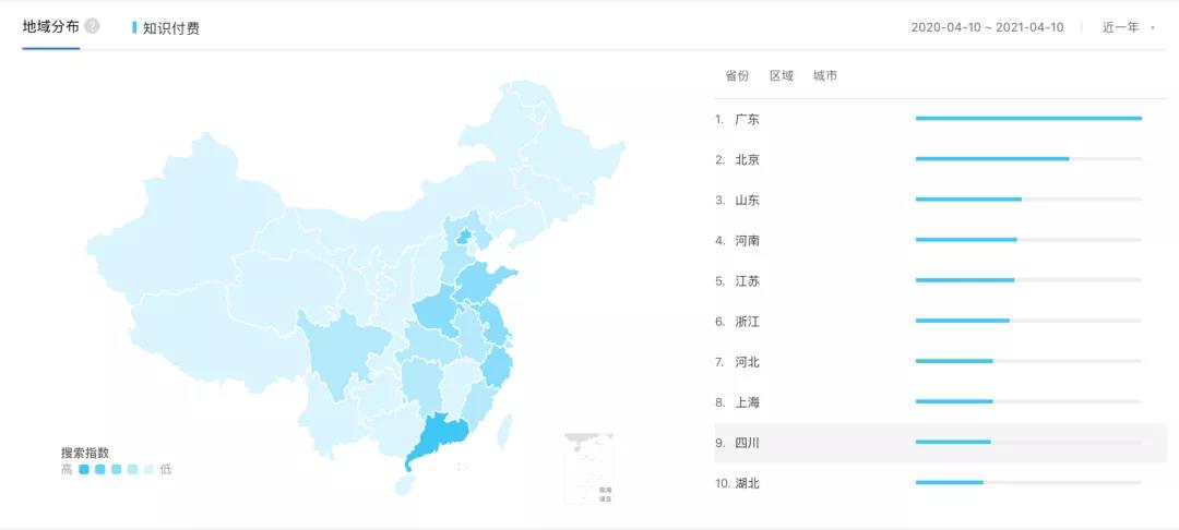 因为媒老板商学院没有被收录进百度指数,所以我找了"知识付费"关键词进行对比,可以看到除了一线省市广东、北京,中部等发展较缓慢的省市也对知识付费很有兴趣,再来就是江浙沪,因此媒老板选在广州和上海进行线下授课