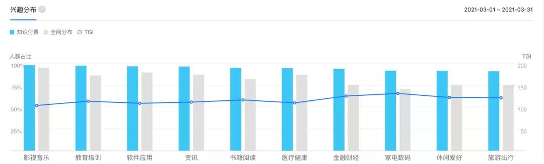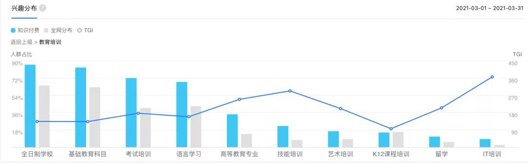 关注知识付费的人在教育培训、金融财经和家电数码上与全网平均分布有较大差异,其中在教育培训里面,大家更关心的是技能培训和IT培训,媒老板主教的私域流量变现刚好符合技能提升。