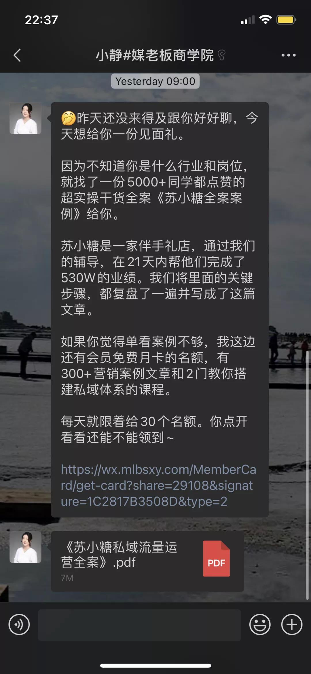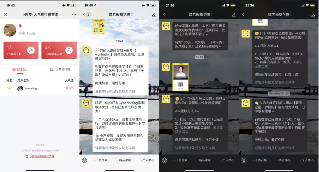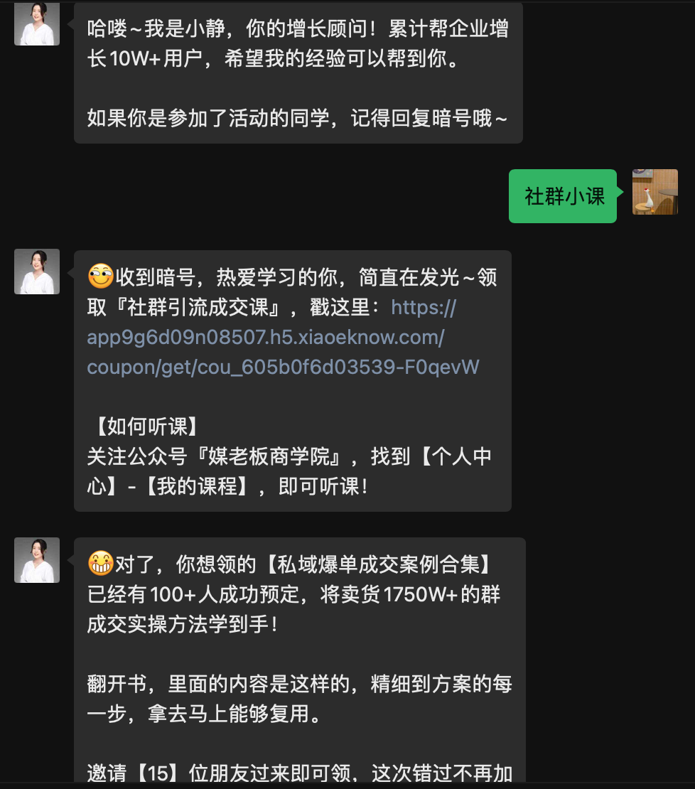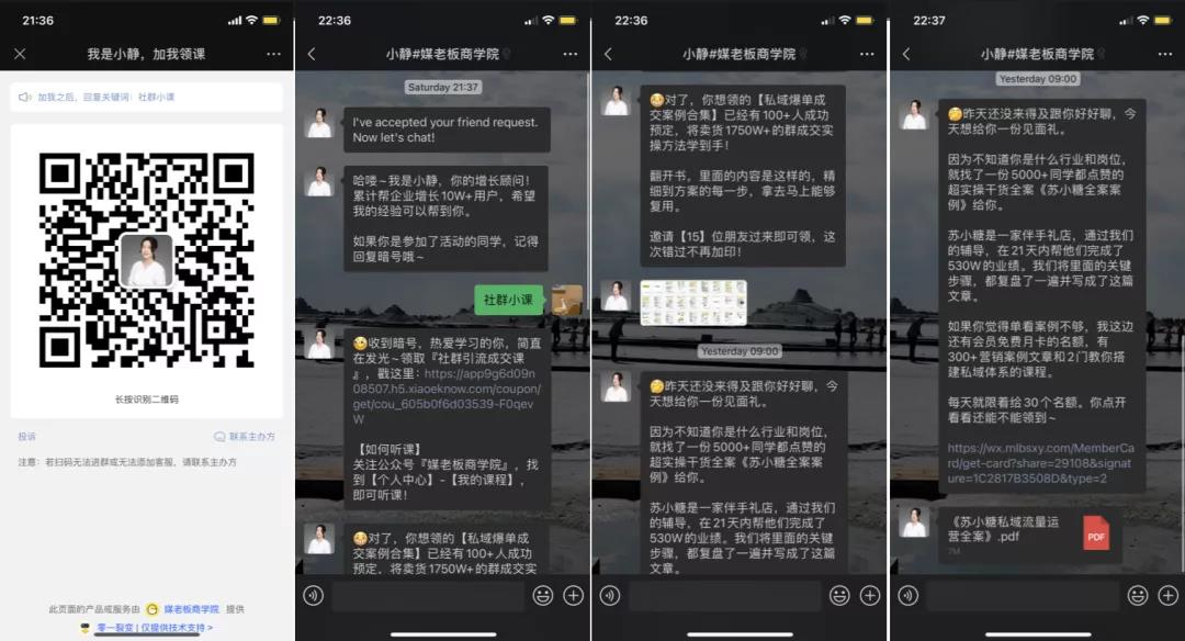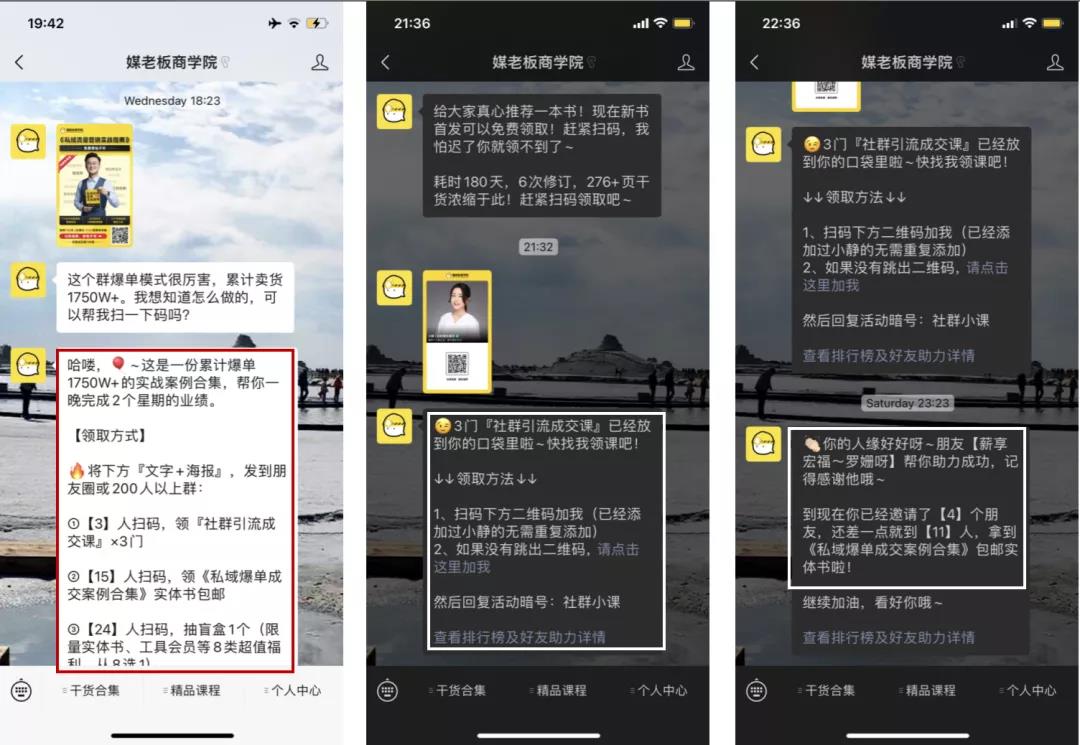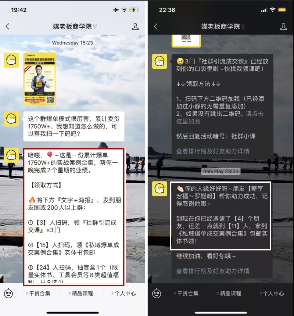 对于分享用户来说,已知的奖励大家往往是没有期待的,而媒老板这次除了已知奖励外,还通过领课后加个人微信的方式,主动给用户提供商学院的实操案例,在给用户加餐的同时也体现出专业性,让用户对他产生更多的信任感