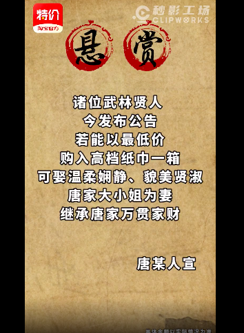 第一个广告视频-以相亲悬赏为引,低价购入最低价高档纸巾为线索,引来三位高端**揭榜。以反崇高,反精英,反逻辑的无厘头方式呈现了三位**的应聘自白。巧妙地融合了产品介绍同时又娱乐了大众。