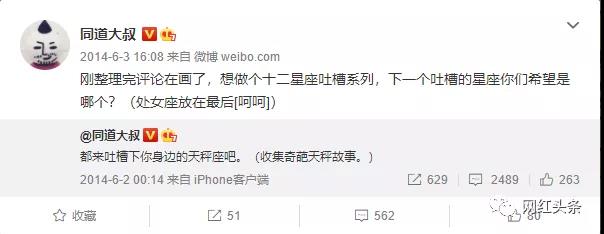 不过这个现象并没有持续太久,14年1月份原创内容正式恢复,并且开始对星座类的内容进行试探,效果还不错,随后在6月2日在微博发表的一篇对天秤座的吐槽收集,因为数据不错,隔天就发微博说要做一个十二星座吐槽系列。