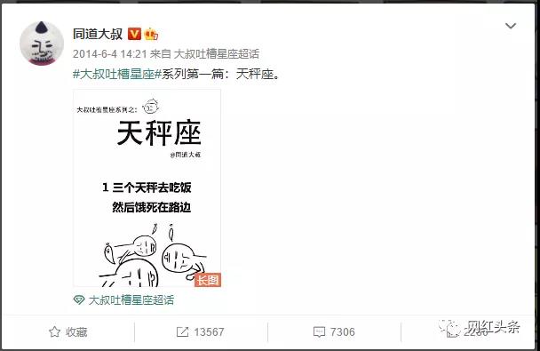 6月4日发布了吐槽星座系列的第一篇:天秤座,一万多的转发量算是一个小爆款了,随后便慢慢推出了各个系列。随着各个系列的推出"同道大叔"的内容定位也逐渐明朗,逐渐开始成为一名真正的网红。