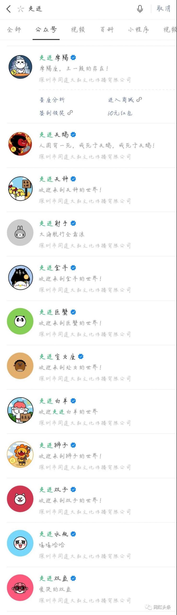 而微信公众号方面,同道大叔开始拓展新的公众号矩阵,十二个星座,各做一个公众号,还有主号"同道大叔"。主号发布的内容更倾向于女性,表现形式也更加丰富。