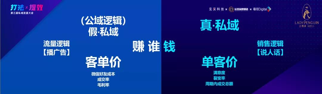 按照公域逻辑来做的都是假私域,他们依靠流量逻辑播广告,来赚"客单价"。比如,在社群里刷广告,追求单个客户获取成本以及成交率和毛利润。有很多企业抱怨私域没有可延续性,就因为他们完全按照公域的逻辑在做。