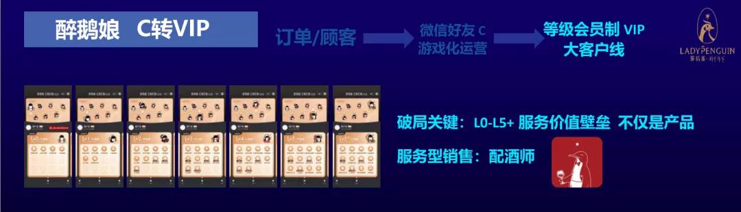 我们会员体系分为七层,每层会员都会享受不同的权益和服务,并且我们个号和企业个号的名字就是"配酒师",听起来就特别像服务的人。我们的服务型销售维系的是我们VIP而不是C。