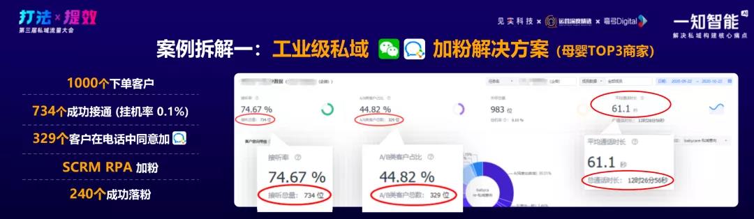 以某母婴品牌为例,1000个用户进入系统进行自动外呼,第一个漏斗是接通率,做到了734个接通,且对应挂机率是0.1%;接着是询问客户加企业微信的意愿,有329个客户同意后变成用户;再通过SCRM RPA加粉,最终240个成为新增粉丝。