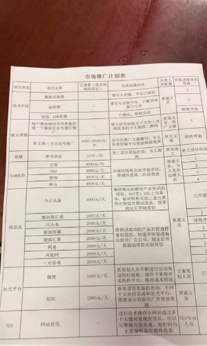 图是很模糊了,我们可以大致看出来他们市场推广计划分了:SEO、SEM、信息流、社交平台、软文营销、纸媒报纸、技术手段等。