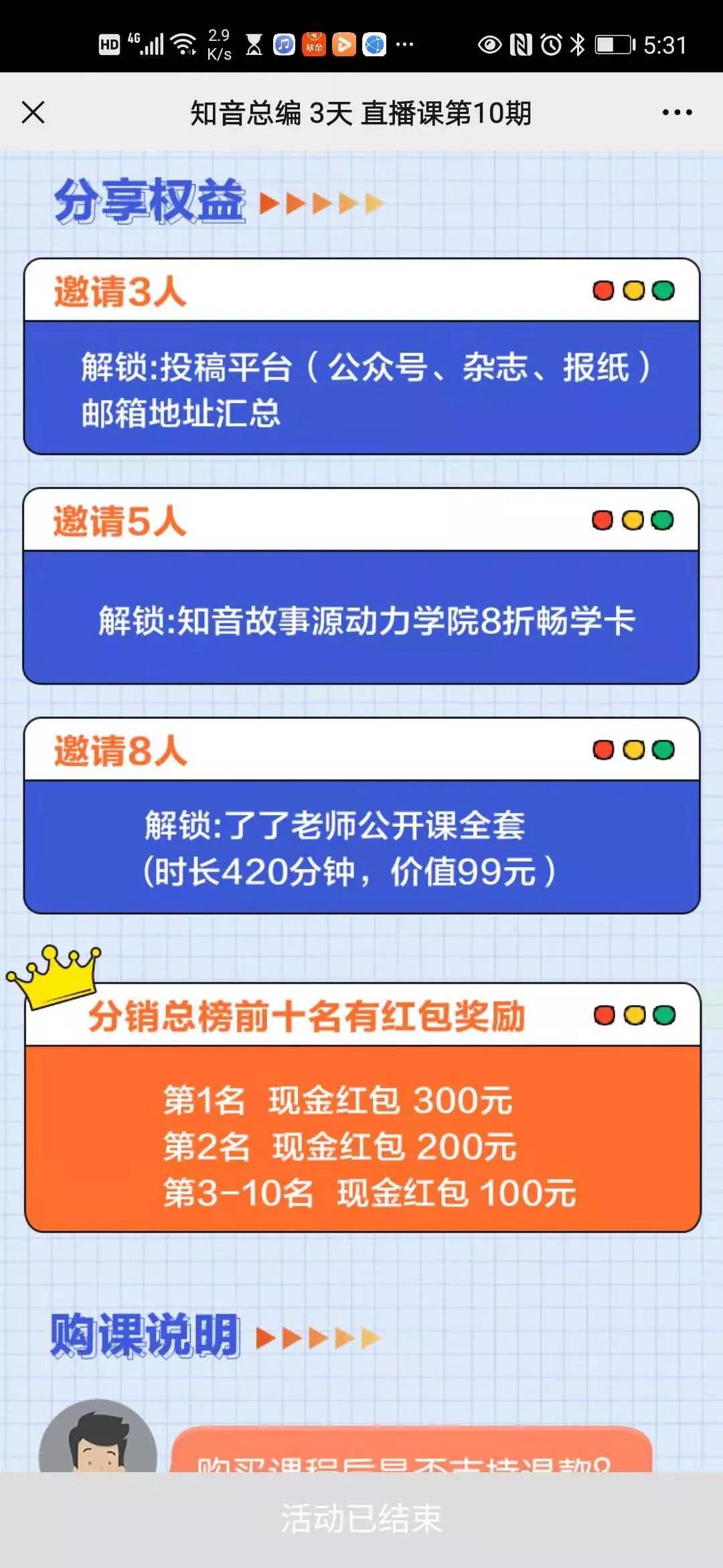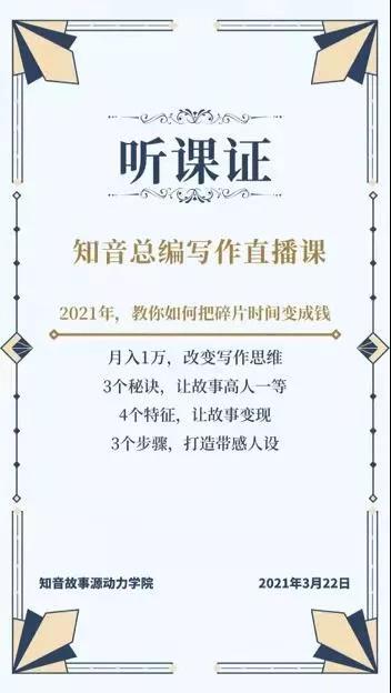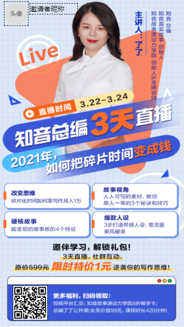 就在3月中旬,知音开启了一次基于训练营课程营销产品的裂变项目,以"知音总编了了老师聊写作变现"为主题的写作直播课进行宣发获客,希望能基于已有的直播课程,帮助知音实现粉丝裂变传播,为后续正价课程做一个规模级的引流。