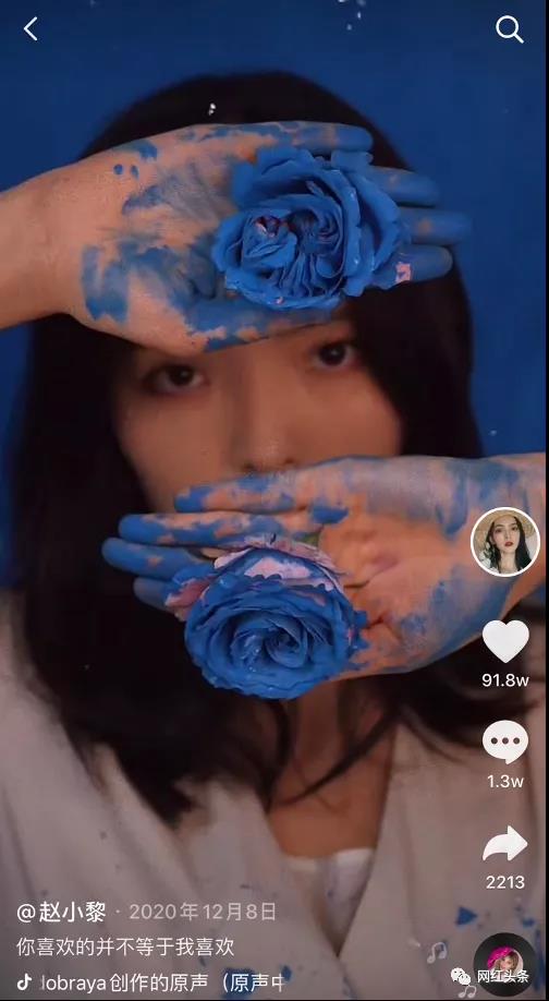 例如2020年12月发布的这条视频,用玫瑰沾染蓝色染料刻画一种忧郁的情绪。